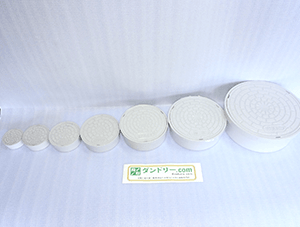 その小口径マスの上部につけるメンテナンス用のフタにも種類が多くあります。一般的には写真のようにライトグレーの樹脂製の蓋がよく使用されます。小口径の配管サイズやVU,VPパイプの寸法に合わせて、サイズは50、65、75、100、125、150、200と各種あります。