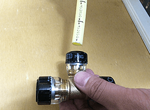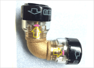内面接合用の継手にはインコアが不要で、写真のように、継手の保護シールをはがして、そのまま樹脂管を継手に挿入します。