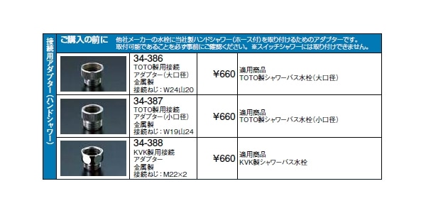 KVK製用接続アダプターの商品について、以下の品番商品がございます。