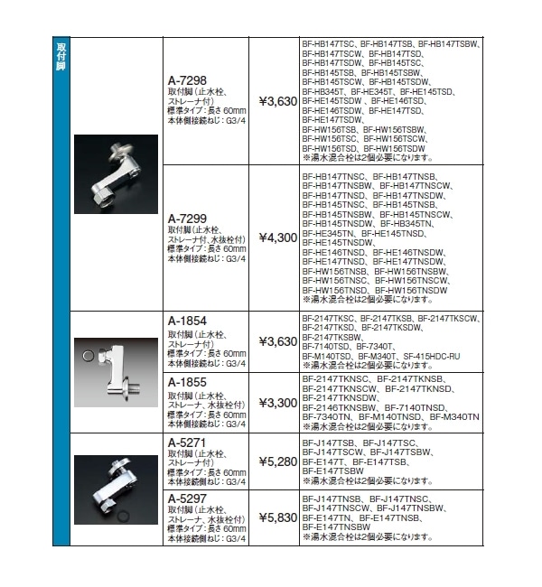 オプションパーツ 取付脚 止水栓・ストレーナー付 長さ60mm