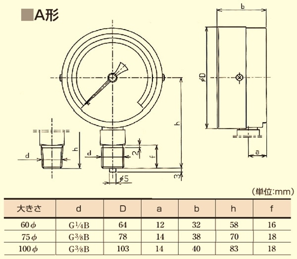 【右下精器製造】 ステンレス圧力計(A型φ75)
