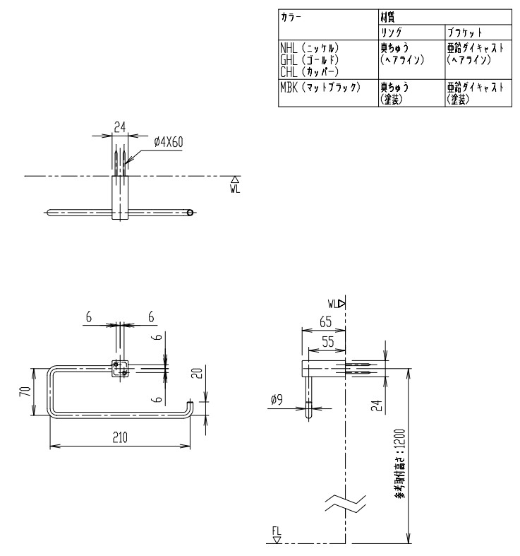 材質(MBK):〈ブラケット〉亜鉛ダイキャスト(塗装)〈リング〉真ちゅう(塗装)