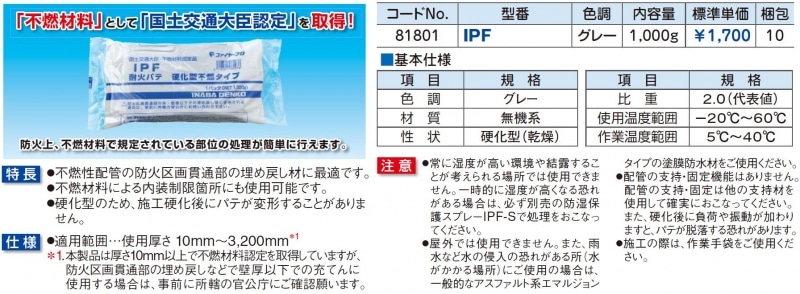 【因幡電機産業】 耐火パテ 硬化型不燃タイプ