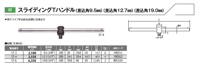 【トップ工業】 スライディングTハンドル(差込角9.5mm)(差込角12.7mm)(差込角19.0mm)