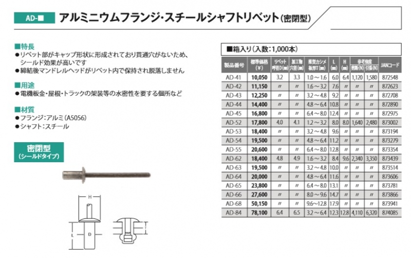 【トップ工業】 アルミニウムフランジ・スチールシャフトリベット(密閉型)