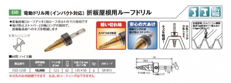 【トップ工業】 電動ドリル用(インパクト対応) 折板屋根用ルーフドリル