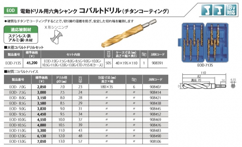 【トップ工業】 電動ドリル用六角シャンク コバルトドリル(チタンコーティング) 大径コバルトドリルセット