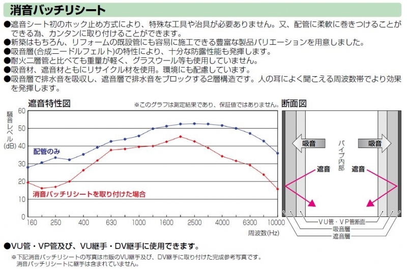 ※消音バッチリシートの写真は市販のVP管及び、DV継手に取り付けた完成参考写真です。消音バッチリシートにVU管及び、継手は含まれていません。